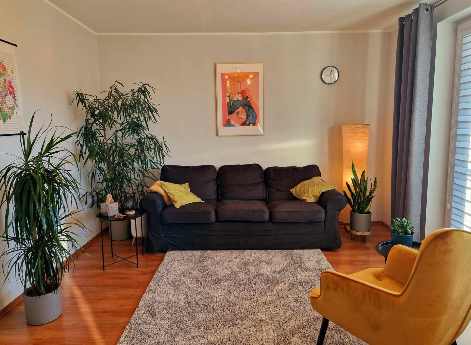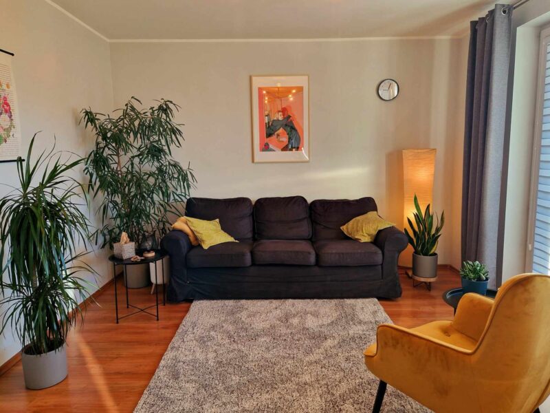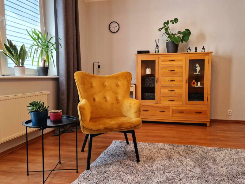 Jasny, przytulny i dobrze oświetlony gabinet zarówno naturalnym światłem, jak i nastrojowymi lampami. Przestrzeń, która daje sporo swobody i możliwości. To miejsce, które sprzyja rozmowie, refleksji i budowaniu relacji – tak, by zarówno Ty, jak i Twoi klienci czuli się tu naprawdę dobrze. Znajdziesz tu wygodną sofę, fotel, stoliki, biurko i szafę – wszystko, co potrzebne, by komfortowo pracować w różnych formach: indywidualnie, z parami, rodzinami czy online.
